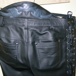 Odinės kelnės. Vyriškos. Naturali oda, juodos spalvos. Juosmuo nugaros srityje paaukštintas. Šoninės siūlės suvarstomos, juosmuo reguliuojamas. Juosmems apimtis nuo 92 cm. iki 100 cm. Kelnės su pamušalu.